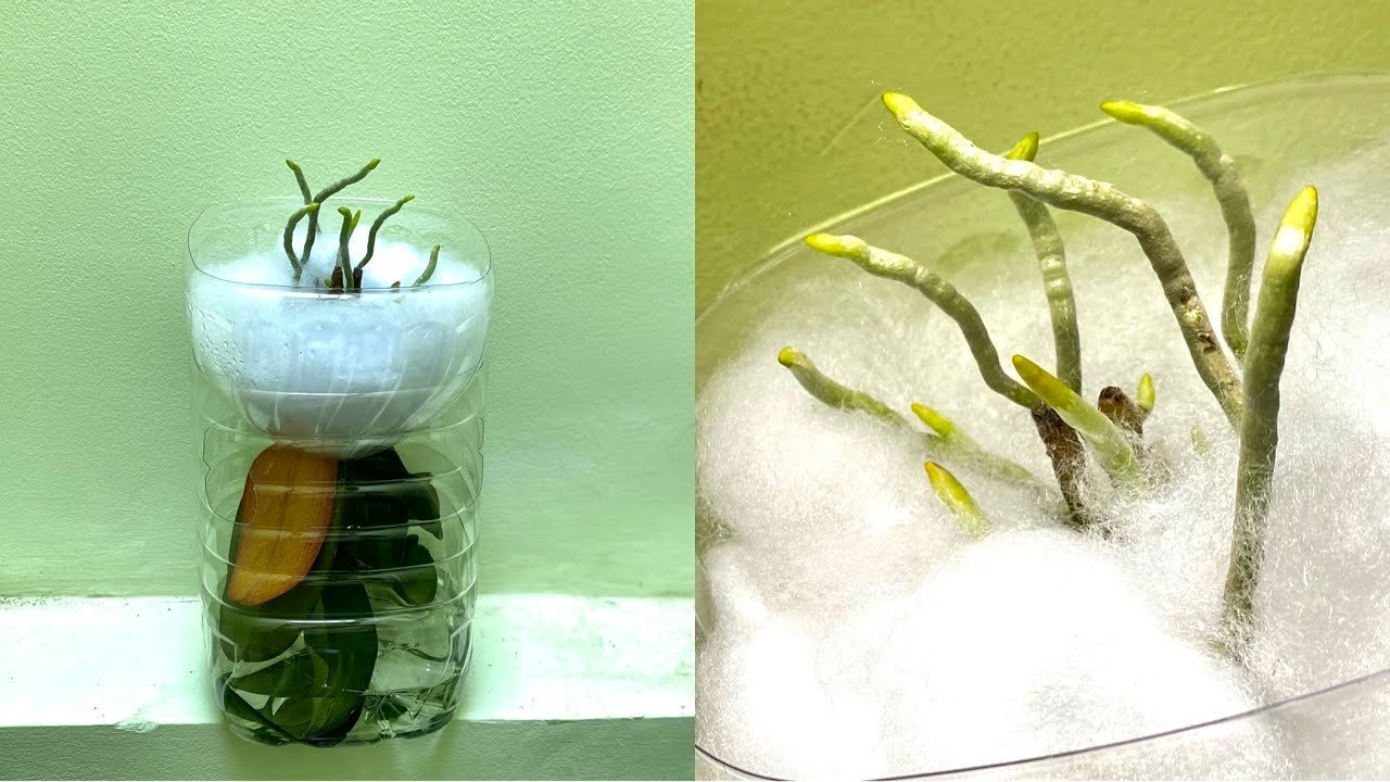 - Cura e Monitoraggio: Copri le radici con un batuffolo di cotone e metti le foglie nell’acqua. Ricorda di aggiungere acqua al fondo della bottiglia ogni 4 giorni e spruzzare il batuffolo di cotone regolarmente. Dopo circa 2 mesi, le foglie saranno più forti e le radici cresceranno rapidamente.