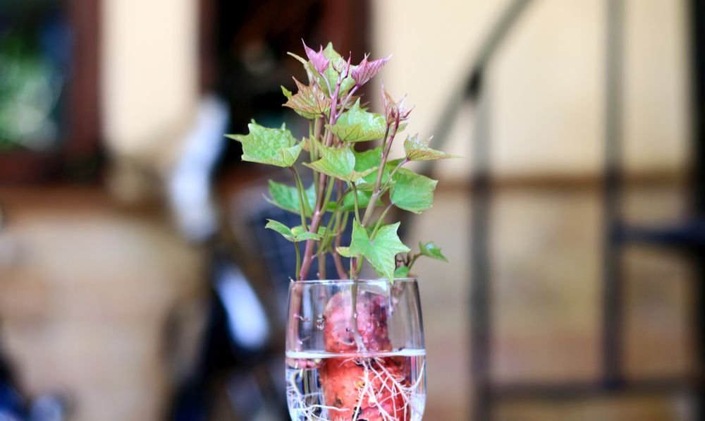 Le patate dolci vengono solitamente coltivate da tuberi germogliati (simili alle patate). Per coltivare il tuo raccolto, metti prima la patata dolce in un bicchiere d’acqua in modo che sia immersa per circa metà. Riponi quindi il barattolo in un luogo caldo e soleggiato e attendi che i germogli spuntino. Una volta che avranno raggiunto una lunghezza di circa 10 cm, potrai piantare le patate dolci.
