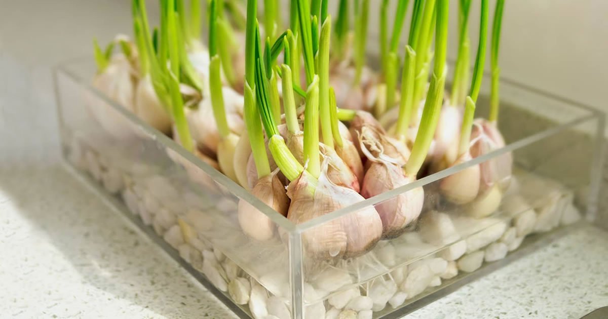 Fate crescere i germogli d’aglio finché non raggiungono un’altezza di circa 7 cm o più. I germogli d’aglio possono essere utilizzati per cucinare o condire i piatti.