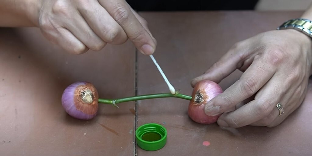 2. Inserisci nelle Cipolle: Prepara le due piccole cipolle rosse. Tagliale a metà e applica un po’ di miele sui boccioli della talea di rosa. Questa pratica favorisce la crescita delle radici e protegge la pianta da eventuali infezioni.