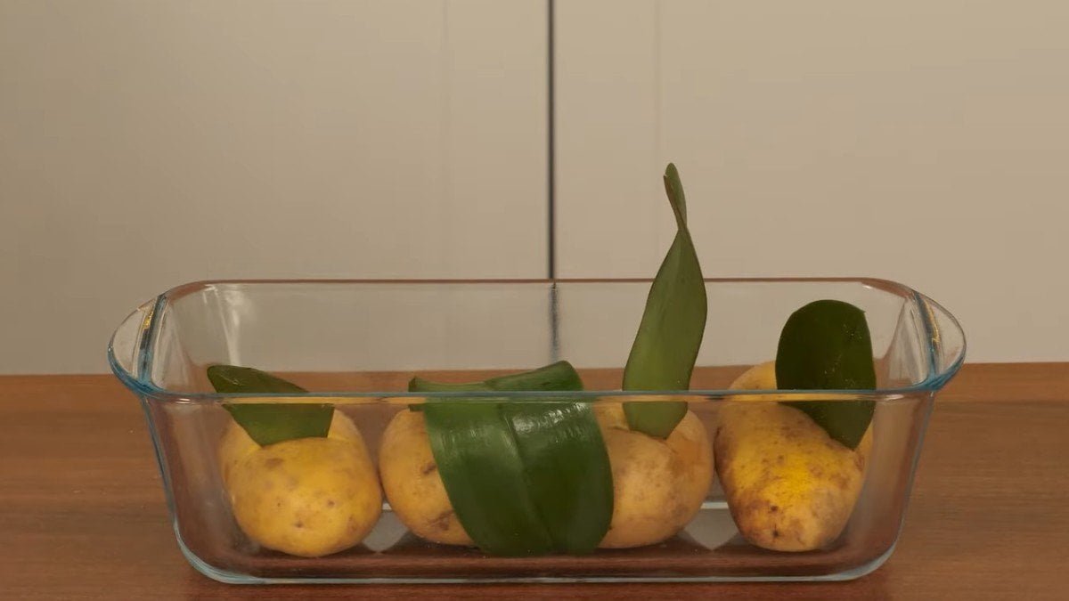 Fai piccoli tagli nelle patate e inserisci le foglie appena tagliate al loro interno. Metti le patate in un contenitore e coprile con muschio umido. Spruzza con acqua da uno spruzzatore se necessario. Il muschio trattiene bene l’umidità. Il risultato arriverà in 10-12 giorni.