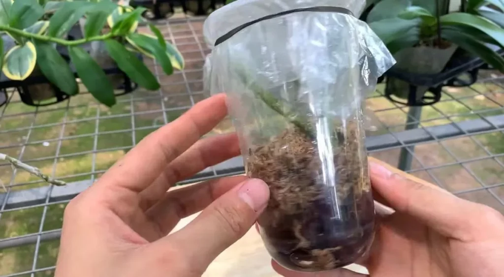 Passaggio 4: Piantare le Talee Pianta delicatamente le talee di orchidea nel substrato umido, assicurandoti che siano a contatto con il muschio. Copri la bottiglia con pellicola trasparente e fissala con un elastico. Se hai utilizzato una bottiglia, rimetti saldamente la parte superiore su quella inferiore, praticando dei fori nella pellicola o nel tappo per consentire la ventilazione.