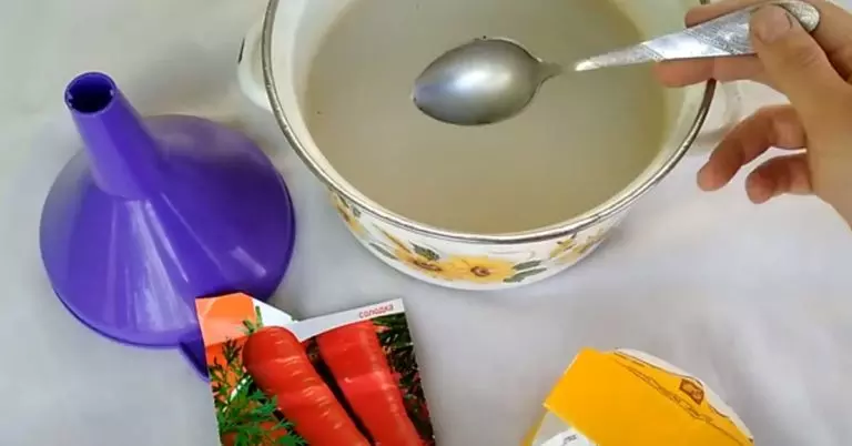Semina delle Carote Nel contenitore pieno di liquido appiccicoso, versare due cucchiai di semi di carota e chiudere ermeticamente il tappo della bottiglia. Agitare vigorosamente per distribuire uniformemente i semi nel liquido. Successivamente, preparare un solco lungo nell’aiuola e versare uniformemente il liquido con i semi lungo il solco. Infine, coprire i semi con terra.